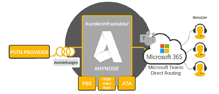 Mit Direct Routing werden Benutzern von Microsoft Teams ein öffentliches Telefonnetz eingerichtet, damit sie externe Anrufe auf jedem Gerät mit Teams tätigen und empfangen können. Dafür benötigen Sie lediglich den Session Border Controller (SBC) von anynode. Der SBC fungiert als Schnittstelle zwischen unterschiedlichsten SIP-Endpunkten – wie z.B. Telefonen, TK-Anlagen und SIP-Providern – und setzt dabei Port- und Adressinformationen um, bietet mehr Sicherheit, übernimmt Routingentscheidungen und führt Rufnummernmanipulation durch.